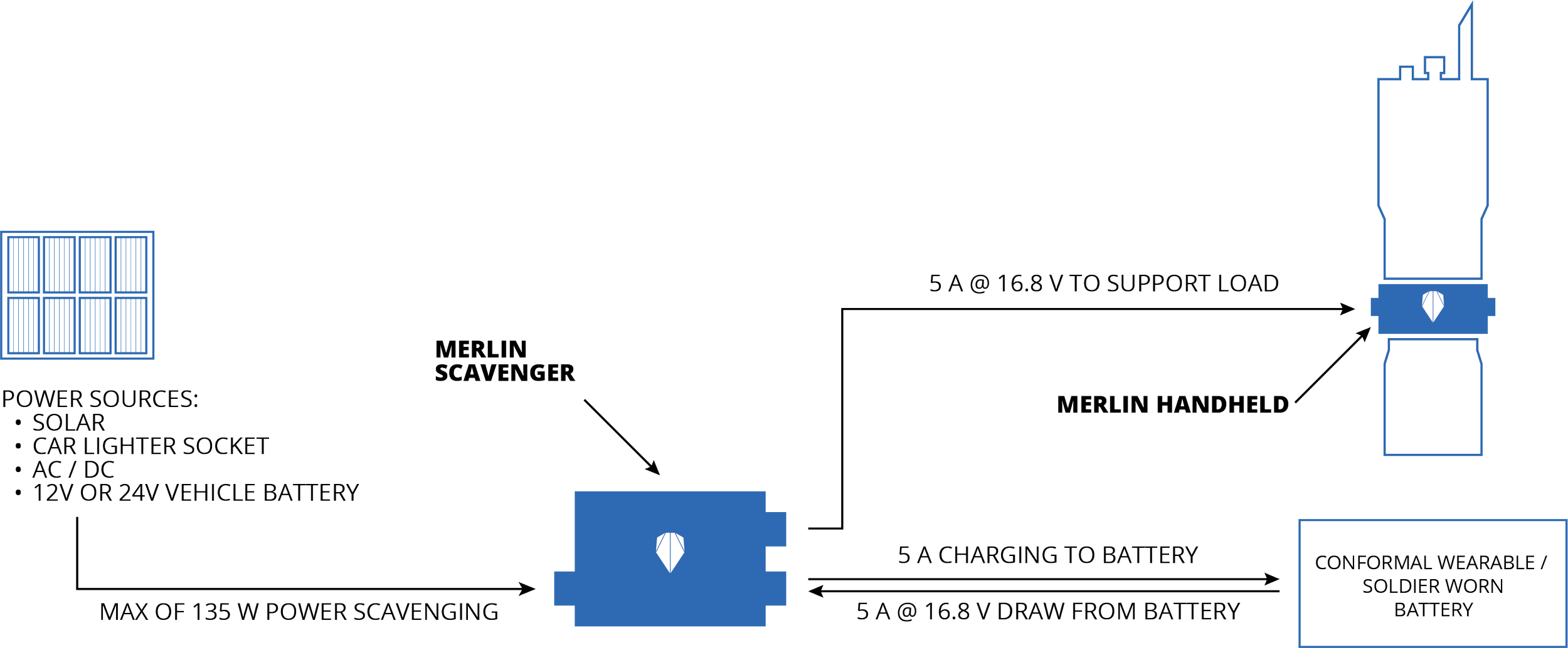 The Merlin Scavenger architecture is optimized to seamlessly integrate into the US Army Nett Warrior System, connecting in-line between a wearable “system battery”, a Conformal Wearable Battery (CWB) or 2590 and the rest of the system (radios, DAGR, EUD).